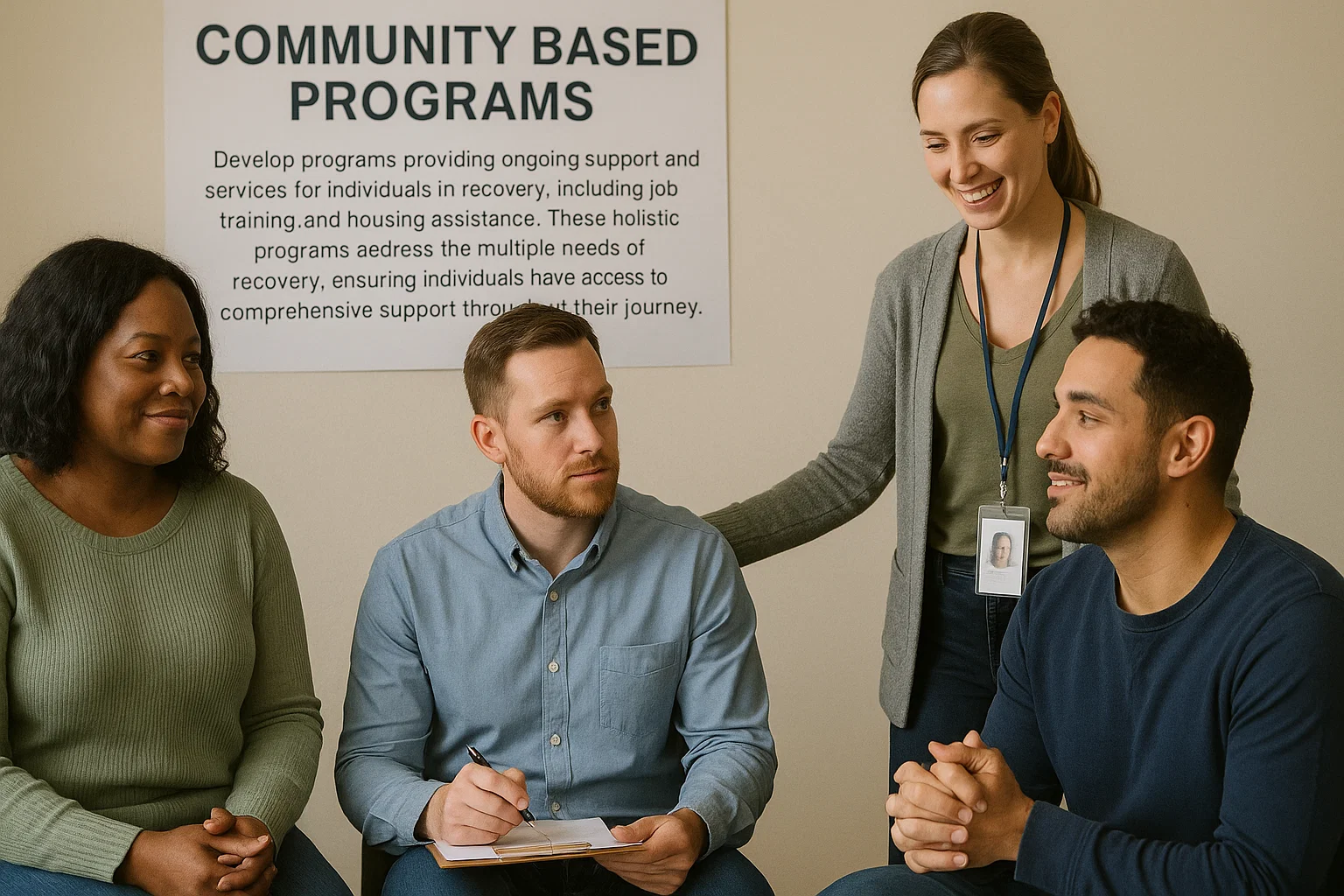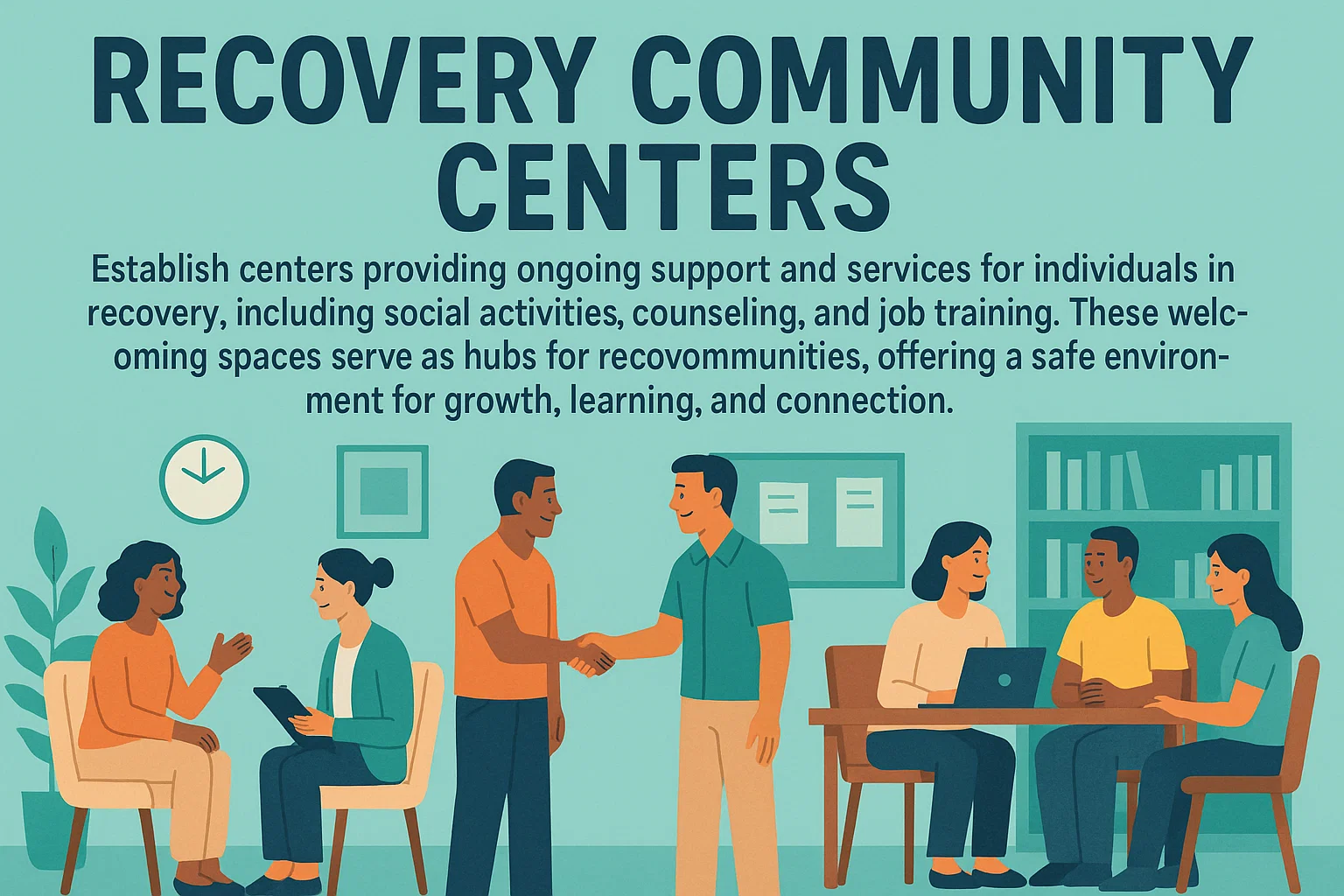 Establish centers providing ongoing support and services for individuals in recovery, including social activities, counseling and job training. These welcoming spaces serve as hubs for recovery communities, offering a safe environment for growth, learning, and connection.