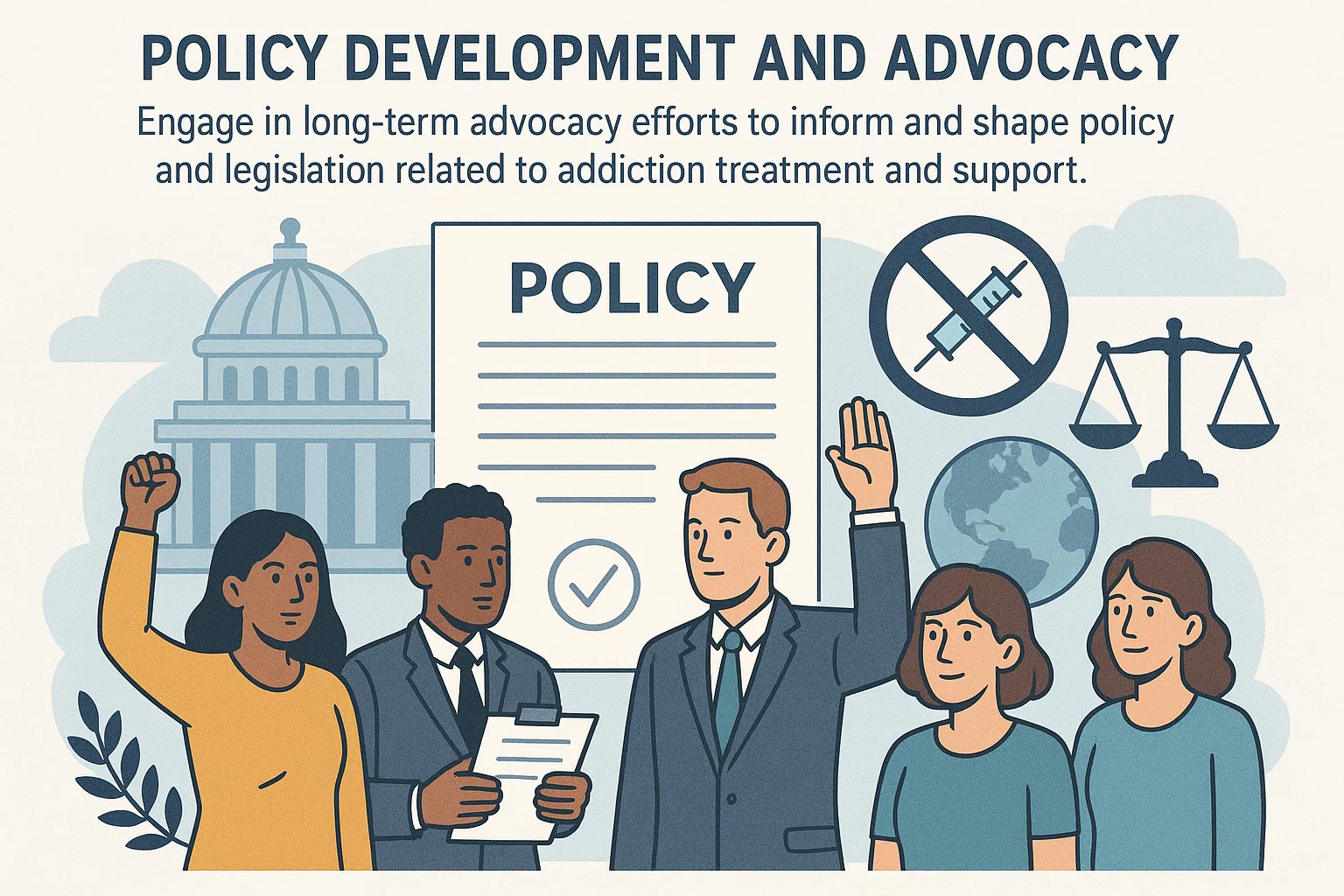 Engage in long-term advocacy efforts to inform and shape policy and legislation related to addiction treatment and support. Working with governments, international organizations, and civil society, we advocate for evidence-based policies that improve treatment access and reduce stigma.