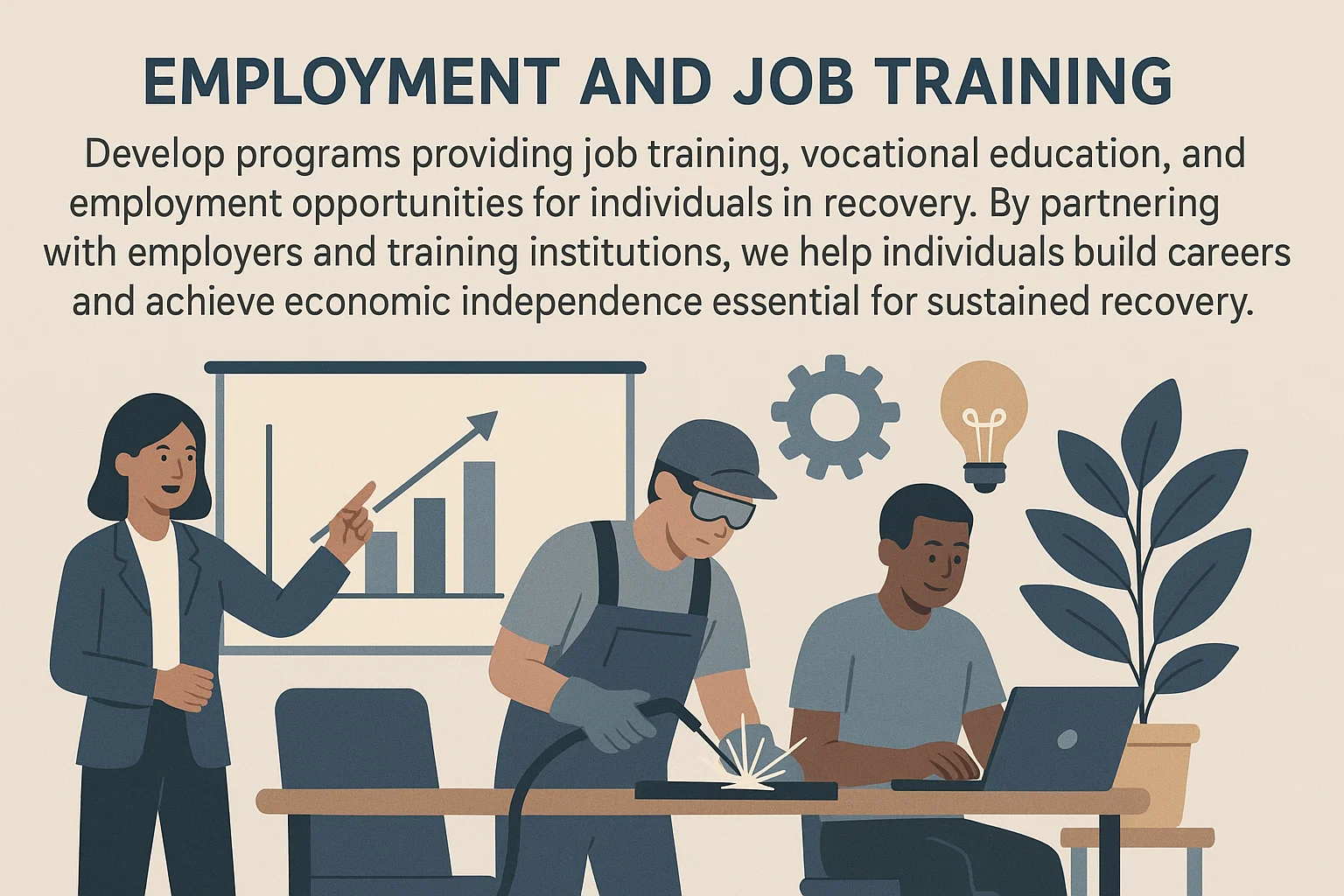 Develop programs providing job training, vocational education, and employment opportunities for individuals in recovery. By partnering with employers and training institutions, we help individuals build careers and achieve economic independence essential for sustained recovery.